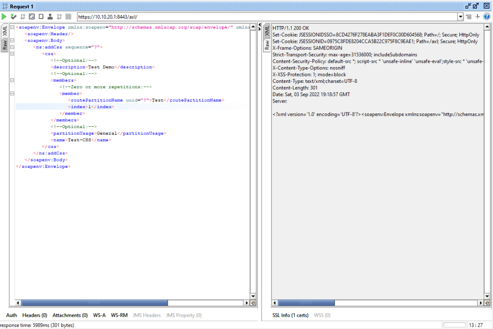 - The following screenshot shows the changes that I made to the default request in order to actually add a CSS to CUCM. As you can see, I added a name, description and partition to my request. The screen on the right side would show us if the request was successful or not. A successful request would result in an HTTP 200 OK message along with the PKID of the CSS (highlighted in yellow below) in <return> tag whereas a failed request would most likely result in a 500 Internal Server Error