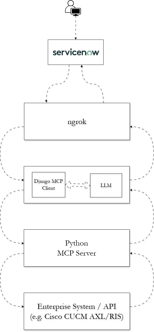 In the last few posts, we have kept our focus on LLMs and Model Context Protocol, especially on their application in the Unified Communications technology space. This post will extend our ongoing dicusssion even further by incorporating an LLM/MCP powered Agent into a ServiceNow driven workflow which involves troubleshooting Voice related issues.