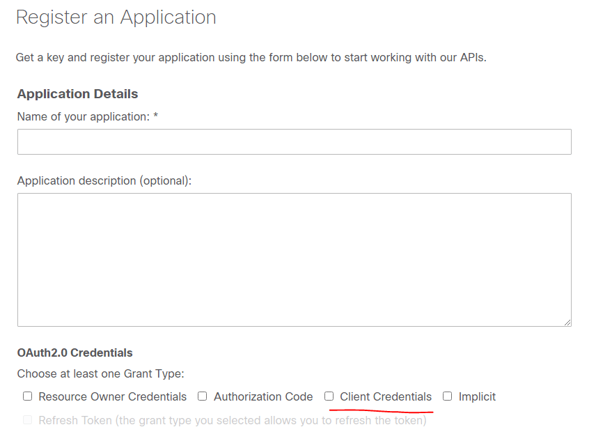 • Give a name to your App and check “Client Credential” as the Grant Type